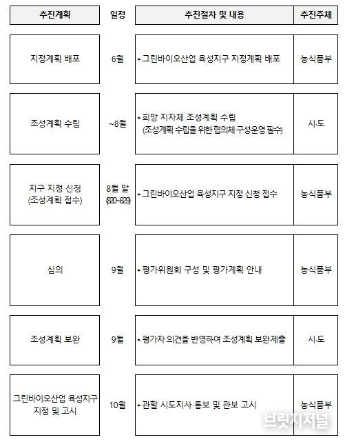 법 시행에 따라 올해 안에 첫 지구 지정을 추진하며, 농식품부는 오는 8월까지 지자체별 조성계획을 접수하고, 산업성·추진역량·정책적합성·실현가능성 등을 종합 평가하여 지구를 지정할 계획이다.