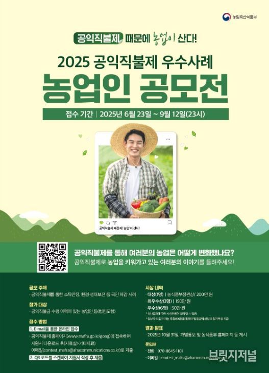 브릿지저널 정보영 기자 | 농림축산식품부는 농업·농촌 공익기능 증진 직접지불제 도입으로 인한 농업·농촌의 유지, 식량안보 기여 및 농업 환경·생태보전 등 현장 성과를 체감할 수 있는 사례를 발굴하고 확산하기 위해 ‘공익직불제 우수사례 공모전’을 처음으로 개최한다고 밝혔다.