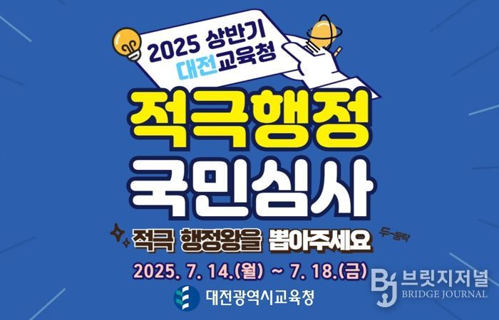 브릿지저널 정보영 기자 | 대전시교육청은 7월 14일부터 18일까지 2025년 상반기 적극행정 우수사례를 선발하기 위한 온라인 국민심사를 실시한다고 밝혔다.
