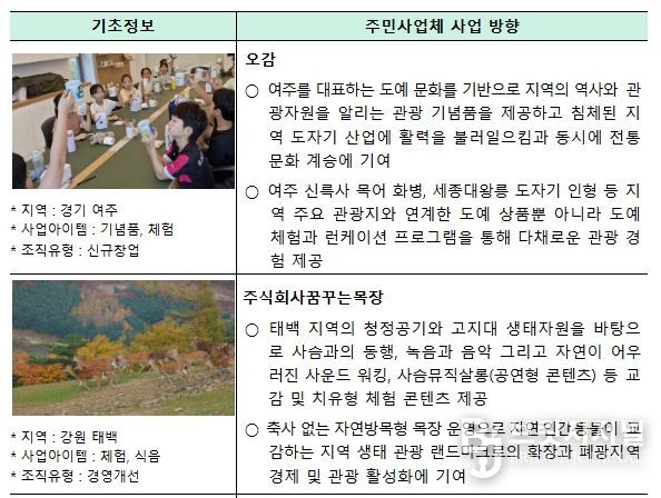 문체부 정책 담당자는 “올해 새롭게 선정된 주민사업체가 관광두레를 통해 지역을 대표하는 브랜드로 성장할 수 있도록 적극 지원해 나가겠다.”라고 밝혔다.