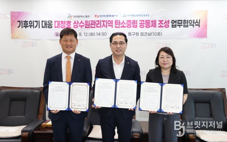 브릿지저널 정보영 기자 | 대전 동구는 12일 구청장 접견실에서 한국전력공사 대전세종충남본부(본부장 신경휴)‧대청호보전운동본부(이사장 고창섭)와 ‘기후위기 대응 대청호 상수원관리지역 탄소중립 공동체 조성’을 위한 3자 업무협약을 체결했다고 밝혔다.