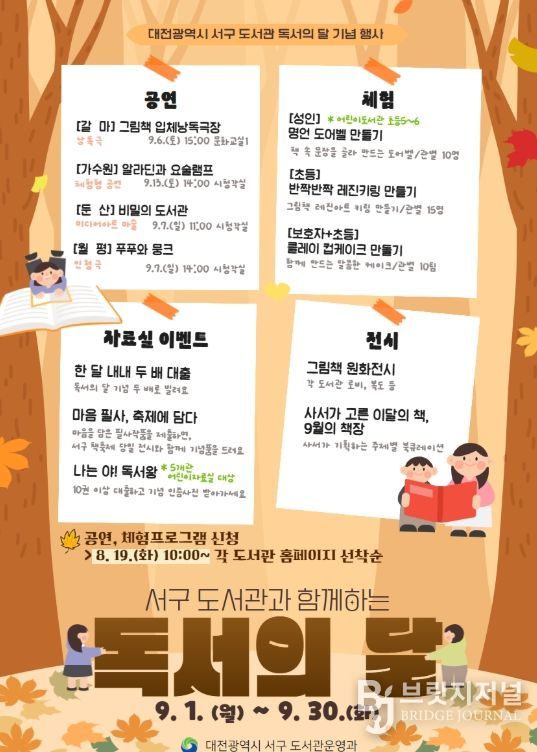 브릿지저널 정보영 기자 | 대전 서구는 9월 독서의 달을 맞아 관내 5개 공공도서관(갈마·가수원·둔산·월평·어린이)에서 다채로운 행사를 한 달간 운영한다.