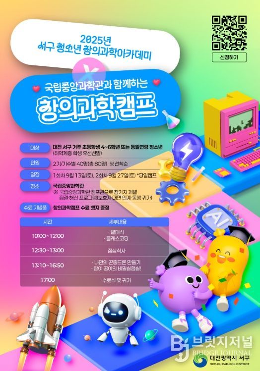 브릿지저널 정보영 기자 | 대전 서구는 과학교육 격차 해소와 창의 인재 양성을 위해 지난 5월부터 운영한 ‘서구 청소년 창의과학아카데미’의 마지막 과정으로 ‘국립중앙과학관과 함께하는 창의 과학 캠프’ 2기 프로그램을 오는 9월 진행한다.