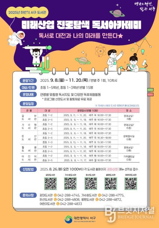 브릿지저널 정보영 기자 | 대전 서구는 관내 공공도서관에서 초·중등생을 대상으로 한 하반기 ‘미래산업 진로 탐색 독서 아카데미’를 운영한다고 이달 19일 밝혔다.
