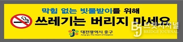 브릿지저널 정보영 기자 | 대전 중구는 쾌적한 도시환경 조성과 빗물받이 악취 저감을 위해 대흥동, 오류동, 은행동 먹자골목 등 관내 주요 지역 빗물받이 주변 250개소에‘막힘없는 빗물받이 만들기’안내표지를 이달 말까지 부착한다고 밝혔다.