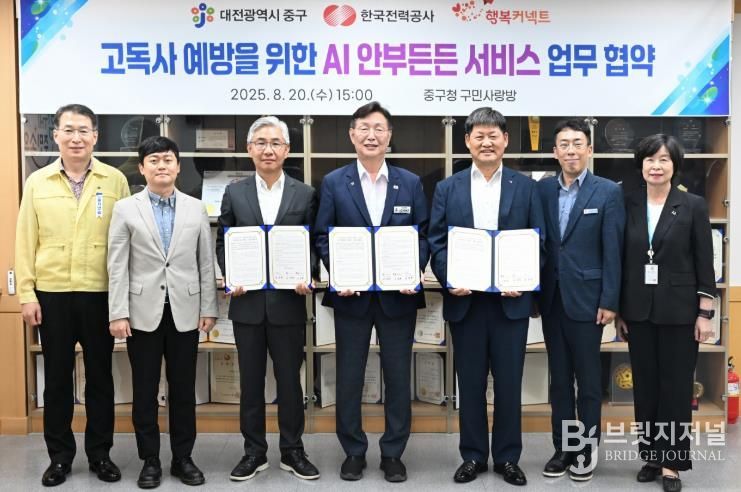 브릿지저널 정보영 기자 | 대전 중구는 고독사 예방 및 위기 상황 신속 대응을 위해 한국전력공사 대전세종충남본부, (재)행복커넥트와 업무협약을 체결하고 지역 내 고립가구 50명을 대상으로 “AI안부든든 서비스”를 시범 운영한다고 20일 밝혔다.