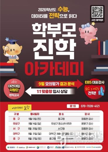 브릿지저널 정보영 기자 | 대전시는 오는 9월 13일 동구를 시작으로 14일 유성구, 20일 서구, 21일 대덕구, 27일 중구에서 ‘학부모 진학 아카데미’를 차례로 진행한다. 수능을 약 80일 앞둔 시점에서 불안을 낮추고 남은 기간 성과를 높일 수 있도록 실질적인 해법을 제시하는 데 초점을 맞췄다.