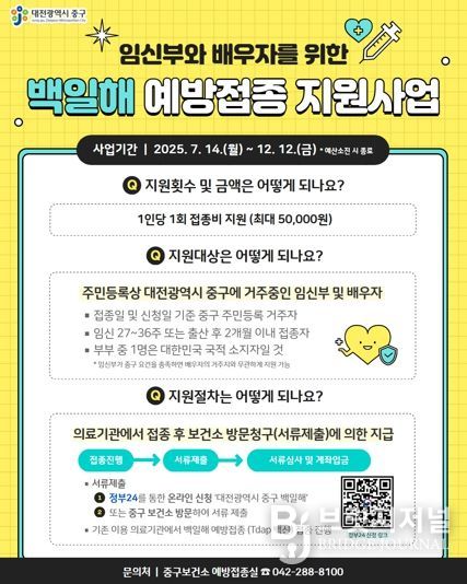브릿지저널 정보영 기자 | 대전 중구는 출산 장려를 위해 추진 중인 임신부 및 배우자 백일해 예방 접종비 지원사업 신청을 ‘정부24’와 연계하여 온라인에서도 가능하도록 확대했다고 22일 밝혔다.