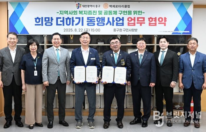 브릿지저널 정보영 기자 | 대전 중구는 지난 22일 지역사회 복지 증진 및 공동체 구현을 위해 백제로타리클럽과 업무협약을 체결했다고 밝혔다.
