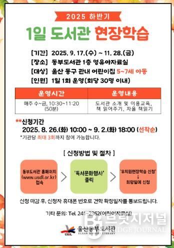 브릿지저널 윤나영 기자 | 울산 동부도서관은 9월 17일부터 11월 28일까지 동구 지역 어린이집 유아들을 대상으로 하반기 ‘일일 도서관 현장학습’을 운영한다.