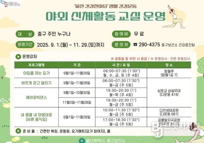 브릿지저널 윤나영 기자 | 울산 중구보건소가 오는 9월 1일부터 11월 29일까지 지역 내 공원과 광장 등에서 주민들을 위한 야외 신체활동 프로그램을 운영한다.