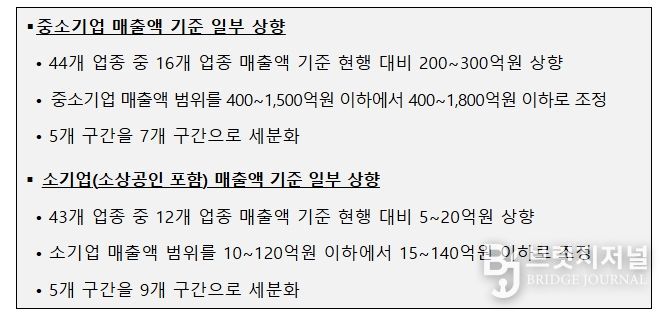 이에, 중기부는 중소기업 매출액 기준을 합리적으로 조정하기 위해 업계, 이해관계자 의견수렴과 관계부처, 학계, 전문가 등 논의를 거쳐 중소기업 44개 업종 중 16개, 소기업 43개 업종 중 12개 업종의 매출액 기준을 상향했으며, 그 후속절차로 중소기업기본법 시행령 개정안이 국무회의에서 의결되어 오는 9월 1일부터 시행될 예정이다.