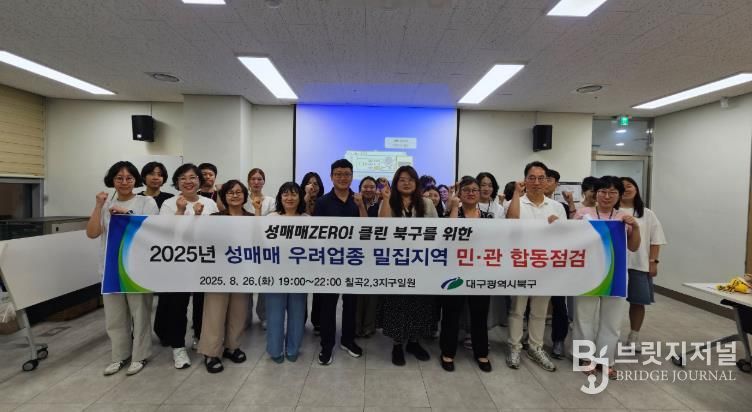 브릿지저널 김진석 기자 | 대구 북구청은 8월 26일 야간에 칠곡 2, 3지구 일대에서 대구시, 북부경찰서, 강북경찰서, 민간 성매매피해자 지원기관과 함께 ‘성매매 없는 깨끗한 북구를 위한 민 ‧ 관 합동점검’을 실시했다.