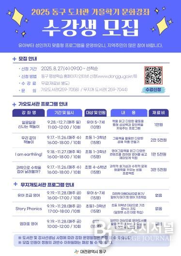 브릿지저널 정보영 기자 | 대전 동구는 다음 달부터 12월까지 운영되는 ‘2025년 도서관 가을학기 문화강좌’ 수강생을 모집한다고 27일 밝혔다.