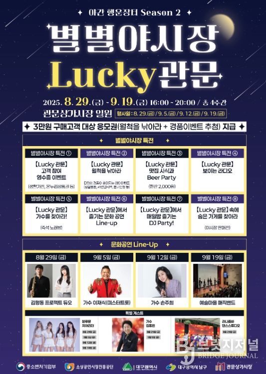 브릿지저널 김진석 기자 | 대구 남구는 관문상가시장(상인회장 박삼수)에서 오는 8월 29일부터 관문상가시장 ‘별별야시장 Lucky관문 야간 행운장터 시즌2’를 개최한다고 밝혔다.