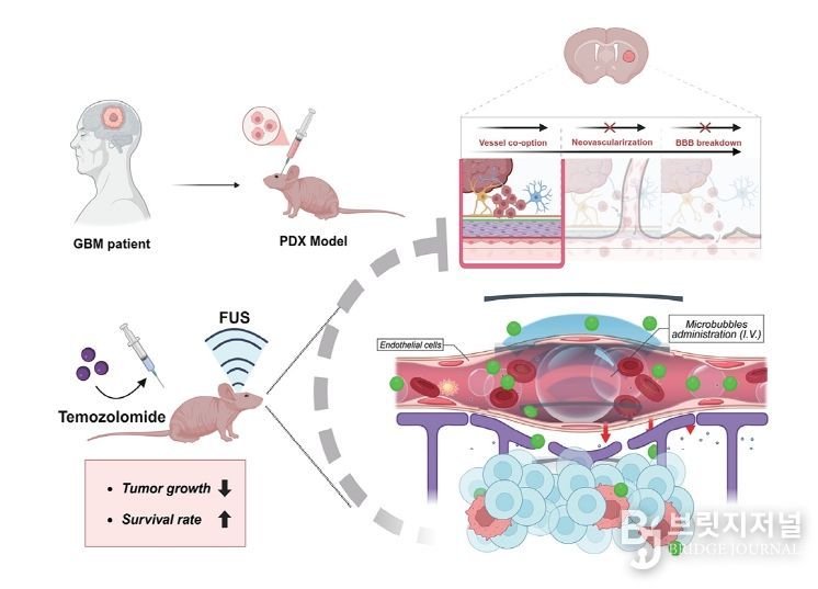 연구진은 연구결과를 국제학술지 ‘Fluids and Barriers of the CNS(IF=6.2)’에 ‘Focused ultrasound-mediated temozolomide delivery into intact blood–brain barrier tissue improves survival in patient-derived xenograft model of glioblastoma’라는 제목으로 발표했다.