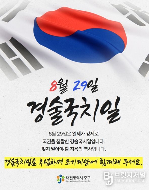 브릿지저널 정보영 기자 | 대전 중구는 8월 29일 경술국치일을 맞아 ‘조기 달기 운동’을 추진 한다.