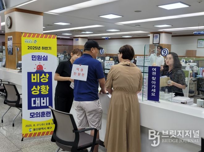 브릿지저널 윤나영 기자 | 울산 북구는 27일 북부경찰서 화봉파출소와 합동으로 하반기 민원실 비상상황 대비 모의훈련을 실시했다.