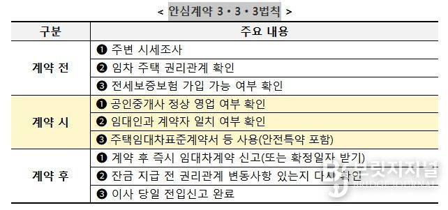 안심계약 3‧3‧3법칙에 따르면, 우선 계약 전 주변 시세를 충분히 조사하고, 등기사항전부증명서(등기부등본) 등을 통해 임차할 주택의 권리관계를 꼼꼼히 확인하며, 전세보증보험 가입이 가능한 집인지 보증사를 통해 문의하는 것이 중요하다는 것을 알 수 있다.
