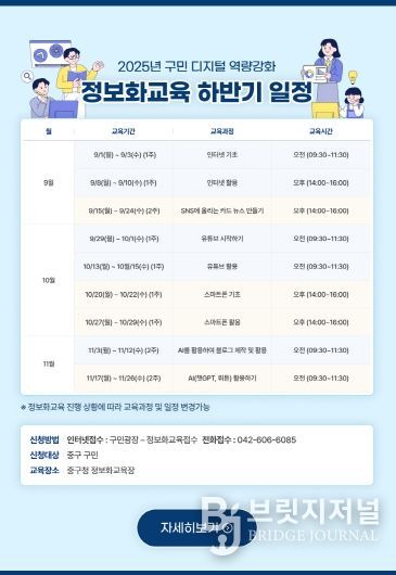 브릿지저널 정보영 기자 | 대전 중구는 2025년 9월 1일부터‘구민 디지털 역량강화 정보화교육’ 하반기 과정을 본격적으로 시작한다고 밝혔다.