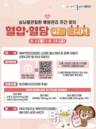브릿지저널 정보영 기자 | 대전 대덕구가 심뇌혈관질환 예방관리주간(9월 1~7일)을 맞아, 오는 9월 1~12일 ‘혈압·혈당 인증 챌린지’를 운영한다고 28일 밝혔다.