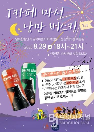 브릿지저널 윤나영 기자 | 남목 마을관리사회적협동조합(이사장 김원옥)은 오는 8월 29일 오후 6시부터 티카페 마성(남목18길 24)에서 ‘제1회 T카페 마성 낭만 버스킹’ 공연을 개최한다.