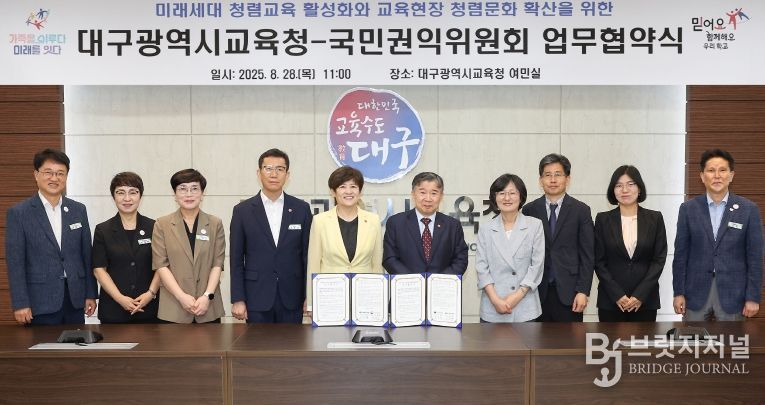브릿지저널 김진석 기자 | 대구시교육청은 8월 28일 오전 11시, 시교육청 접견실에서 국민권익위원회(위원장 유철환)와 ‘미래세대 청렴교육 활성화 및 교육현장 청렴문화 확산을 위한 업무 협약’을 체결했다.