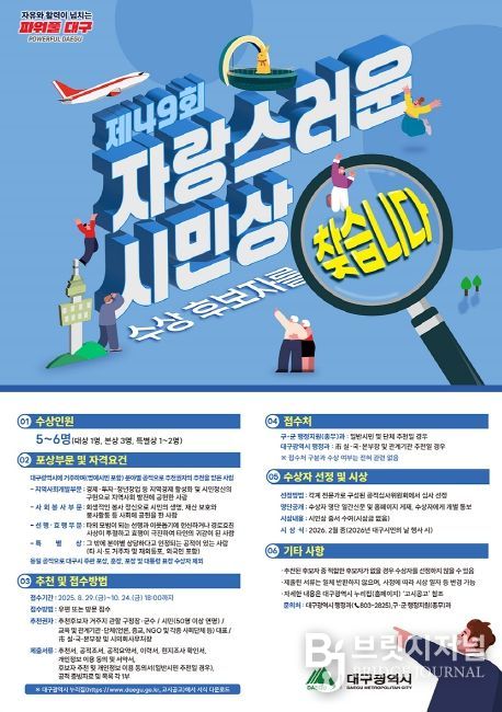 브릿지저널 김진석 기자 | 대구광역시는 지역사회 발전을 위해 헌신하고 선행과 효행으로 타의 모범이 되는 시민을 발굴해 시상하기 위해 8월 29일부터 10월 24일까지 ‘제49회 자랑스러운 시민상’ 후보자를 공개 모집한다.