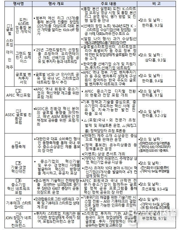 또한 ‘APEC 장관회의 주간’에는 사전행사인 동행축제 개막식(8.30-31)을 시작으로 ‘Global Startup Day in Jeju’, 기술경영혁신대전 등 중소·벤처기업 및 소상공인을 아우르는 8개의 중기부 대표 행사들이 함께 개최될 예정이다.