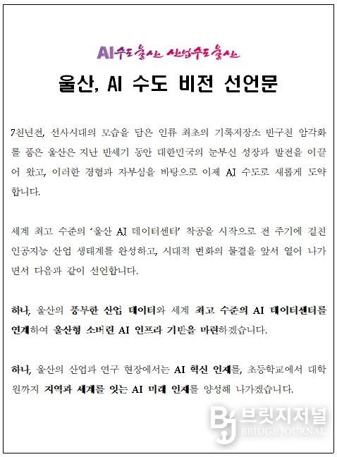 브릿지저널 윤나영 기자 | 울산시가 전통 제조산업 강자에서 인공지능(AI) 산업의 중심지로 도약을 선언한다
