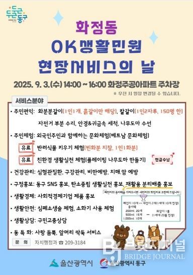 브릿지저널 윤나영 기자 | 울산 동구는 오는 9월 3일 오후 2시부터 4시까지 화정주공아파트 103동과 104동 사이 주차장에서 ‘화정동 OK 생활민원 현장서비스의 날’ 행사를 개최한다.