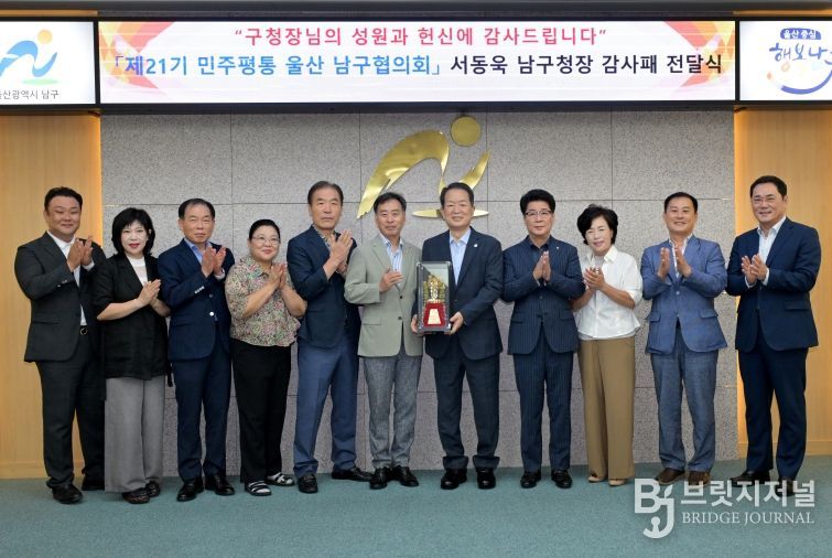 브릿지저널 윤나영 기자 | 제21기 민주평화통일자문회의(이하 민주평통) 울산남구협의회(회장 장수철)에서 29일 지역사회 내 통일 공감대 형성과 주민 참여 확대에 크게 기여한 공로를 인정해 서동욱 남구청장에게 감사패를 전달했다.