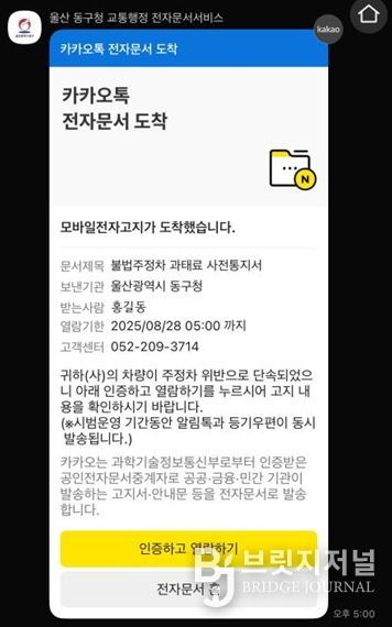 브릿지저널 윤나영 기자 | 울산 동구는 울산시 5개 구군 최초로 도입한 불법 주정차 과태료에 대한 모바일 전자고지 서비스를 8월 한 달간 시범 운영을 마치고 9월 1일부터 전면 시행한다.