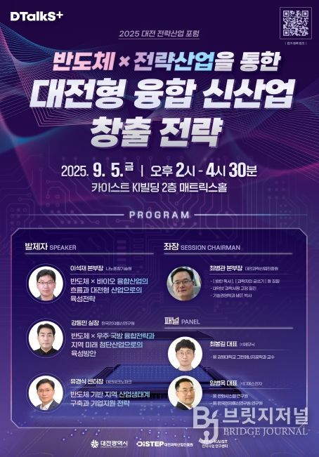 브릿지저널 정보영 기자 | 대전시는 대전과학산업진흥원(DiSTEP)과 함께 오는 9월 5일 오후 2시 카이스트 KI빌딩 2층 매트릭스홀에서 '2025 대전 전략산업 포럼–반도체산업'을 개최한다.