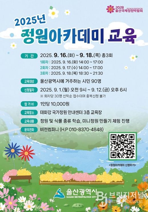 브릿지저널 윤나영 기자 | 울산시는 오는 9월 16일부터 18일까지 3일간 운영되는‘정원아카데미’교육에 참여할 시민 90명을 모집한다고 밝혔다.