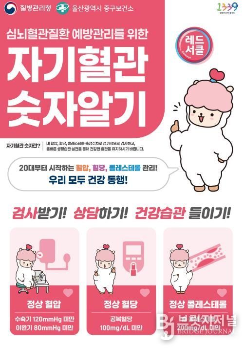 브릿지저널 윤나영 기자 | 울산 중구보건소가 심뇌혈관질환 예방관리주간(9. 1.~9. 7.)을 맞아 9월 한 달 동안 ‘자기혈관 숫자알기, 레드서클 캠페인’을 실시한다.