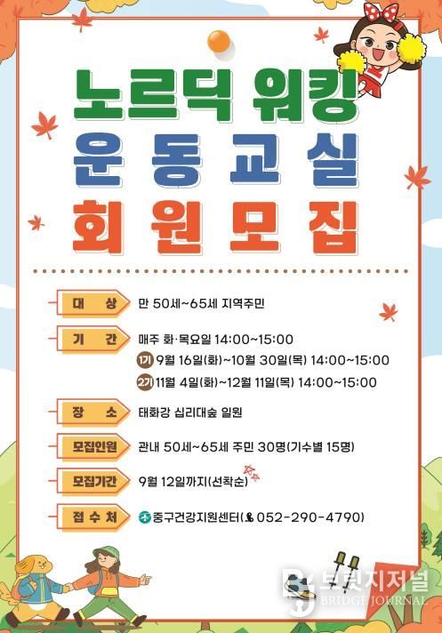 브릿지저널 윤나영 기자 | 울산 중구보건소에서 운영하는 중구건강지원센터가 오는 9월 12일까지 북유럽식 걷기(노르딕 워킹) 운동교실 참여자를 모집한다.