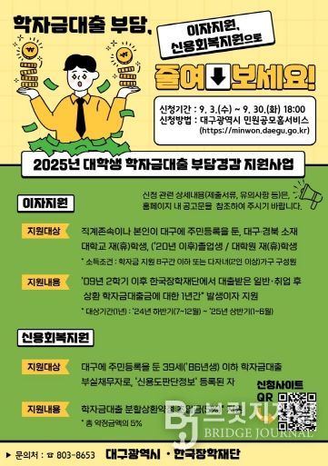 브릿지저널 김진석 기자 | 대구광역시는 지역 청년들이 경제적 부담을 덜고 학업과 취업에 전념할 수 있도록 ‘2025년 대학생 학자금대출 부담경감 지원사업’을 추진한다.