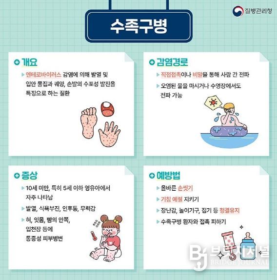 브릿지저널 김진석 기자 | 대구광역시는 9월 영유아를 중심으로 한 수족구병 발생 증가가 우려됨에 따라 영유아 가정과 보육시설에 예방수칙 준수를 당부했다.