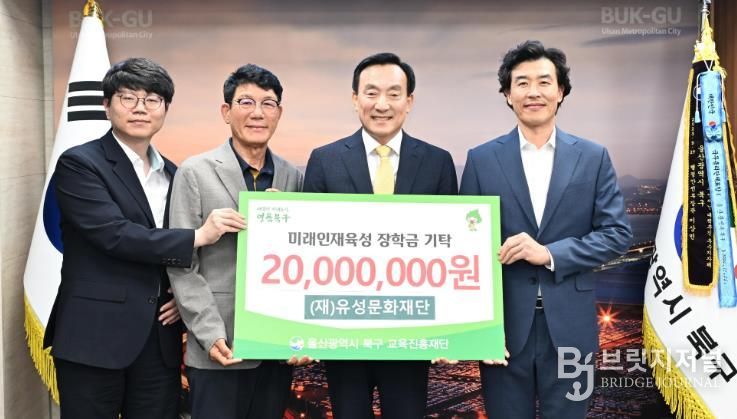 브릿지저널 윤나영 기자 | (재)유성문화재단이 2일 울산 북구교육진흥재단에 지역 인재 육성을 위한 장학금 2천만원을 전달했다.
