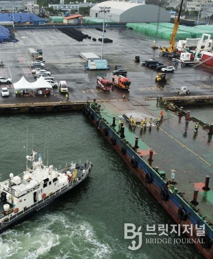 브릿지저널 윤나영 기자 | 울산해양경찰서는 9월 2일 오후 14시부터 울산항 일반부두 해상에서 바지선박에 적재된 전기차량(건설장비) 화재를 가정한 합동 대응 훈련을 실시했다고 밝혔다. 이번 훈련에는 울산항 해상 교통관제센터, 울산 항만공사, 울산남부소방, 울산중앙병원, 예선업협회 6개 기관이 함께 참여했다.
