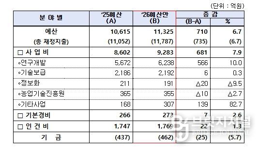 브릿지저널 정보영 기자 | 농촌진흥청은 내년도 예산안이 올해 대비 6.7%(710억 원) 증가한 1조 1,325억 원 규모로 편성됐다고 밝혔다. 이중 연구개발(R&D) 분야는 6,238억 원으로 2025년 5,672억 원 대비 10.0%(566억 원) 증가했다.