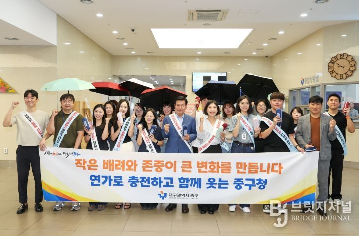 브릿지저널 김진석 기자 | 대구 중구는 지난 3일 구청 로비에서 혁신사업 발굴단 ‘조직혁신팀’과 함께 ‘일하는 방식 및 조직문화 개선 캠페인’을 개최했다.