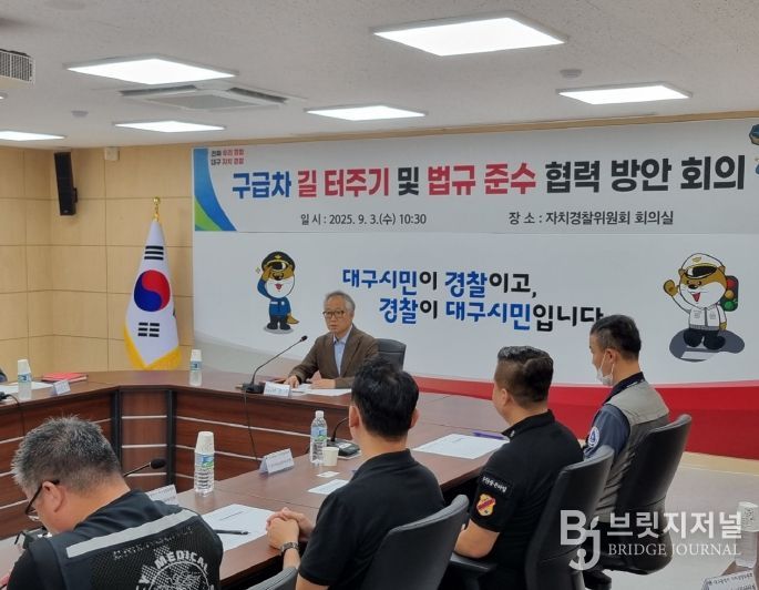 브릿지저널 김진석 기자 | 대구광역시 자치경찰위원회는 9월 3일, 대구시청 산격청사에서 대구시 보건의료정책과, 대구경찰청, 11개 경찰서, 7개 민간이송업체와 함께 ‘긴급구급차 길 터주기’ 및 비긴급 구급차 법규위반 예방을 위한 간담회를 개최했다.