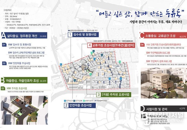 사업의 주요 내용으로는 ▲주민을 위한 문화·복지 및 공동체 활동 공간을 마련하는 ‘두류온(溫)센터’를 조성해 주민 간 소통과 교류를 활성화하고, ▲고질적인 주차난과 불법주정차 문제를 해소해 보행환경을 개선하는 ‘마을주차장 조성’이 포함된다.