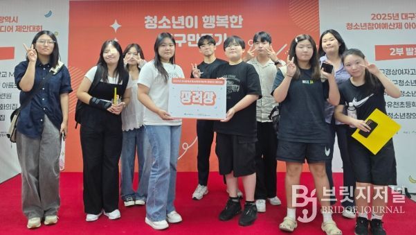 브릿지저널 김진석 기자 | 대구 북구청은 지난 8월 30일 토요일, 대구광역시 행복진흥사회서비스원에서 개최된 『2025년 대구광역시 청소년참여예산제 아이디어 제안대회』에서 북구청소년참여위원회 ‘π(파이)’와 북구청소년운영위원회 ‘오늘’이 각각 장려상을 수상했다고 밝혔다.