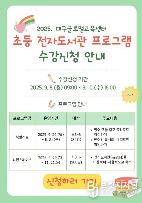 브릿지저널 김진석 기자 | 대구교육연수원 산하 대구글로벌교육센터는 9월 29일부터 11월 21일까지 초등학교 3~6학년 학생 284명을 대상으로 영어 문해력 향상과 자기주도적인 독서 습관 형성을 위해 전자도서관을 활용한‘초등 온라인 영어 독서 프로그램’을 운영한다.