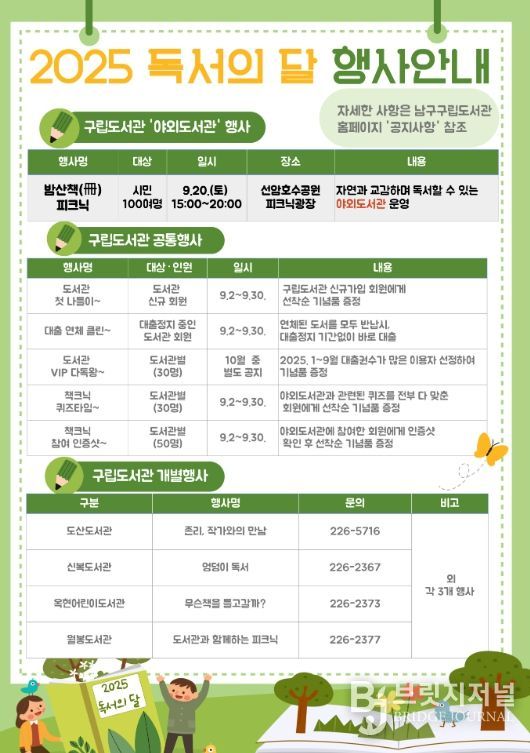 브릿지저널 윤나영 기자 | 울산 남구 구립도서관에서는 독서의 달 9월을 맞아 한 달간 지역 주민들을 위한 다채로운 독서 문화 프로그램을 운영한다.