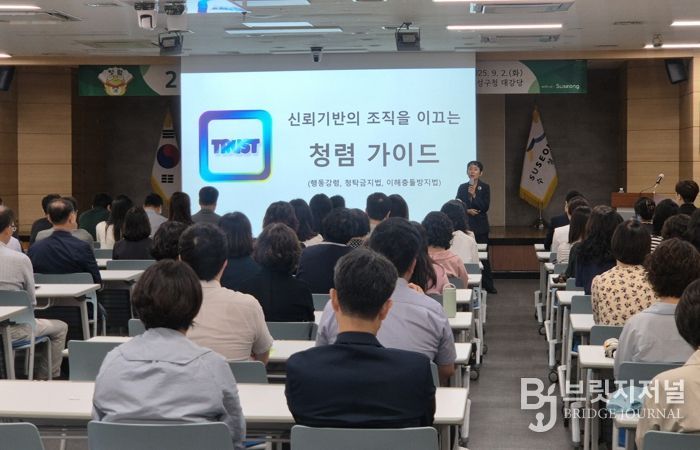 브릿지저널 김진석 기자 | 대구 수성구는 지난 2일 간부공무원을 포함한 전 직원을 대상으로 올바른 공직관 정립과 청렴역량 강화를 위한 2025년도 반부패 청렴교육을 실시했다.