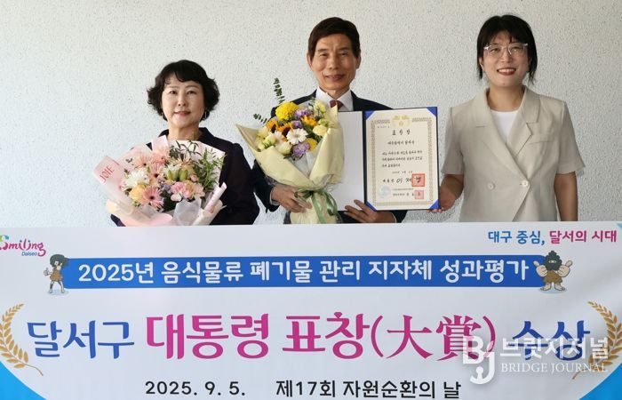 브릿지저널 김진석 기자 | 대구 달서구는 지난 5일 김제실내체육관에서 열린 제17회 자원순환의 날 기념식에서 환경부 주최 ‘2025년 음식물류 폐기물 관리 지자체 성과평가’ 전국 1위로 선정돼 대통령 표창을 받았다.